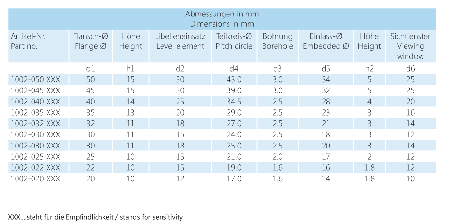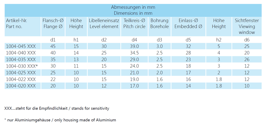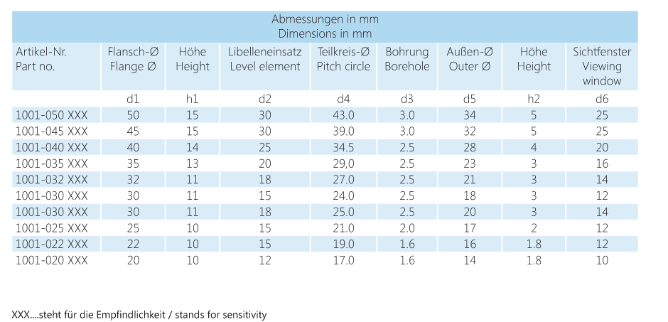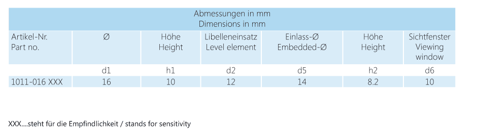 Die Empfindlichkeit der Dosenlibelle ist je nach gewünschtem Libelleneinsatz. Passende Libelleneinsätze finden Sie im Bereich »Libelleneinsätze«. Als Standard verwenden wir Libelleneinsätze Modell 1503 mit einer Empfindlichkeit von 30‘ – 40‘ und einem schwarzen Kontrastring (SK) um die Luftblase besser erkennen zu können.